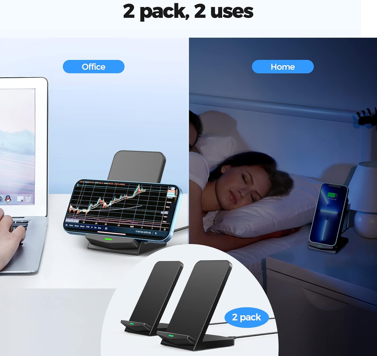 With this Wireless Charger set, you can enjoy the freedom of charging your devices without the hassle of cables. Simply place your device on the stand, and watch as it powers up quickly and efficiently. The sleek and modern design of the charging stands will complement any workspace or home decor, while the durable construction ensures long-lasting performance.